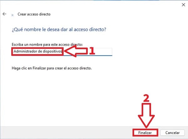 - En el siguiente paso tendremos la posibilidad de ponerle un nombre al acceso directo. Lo ideal es llamarlo «Administrador de Dispositivos» para evitar malentendidos.