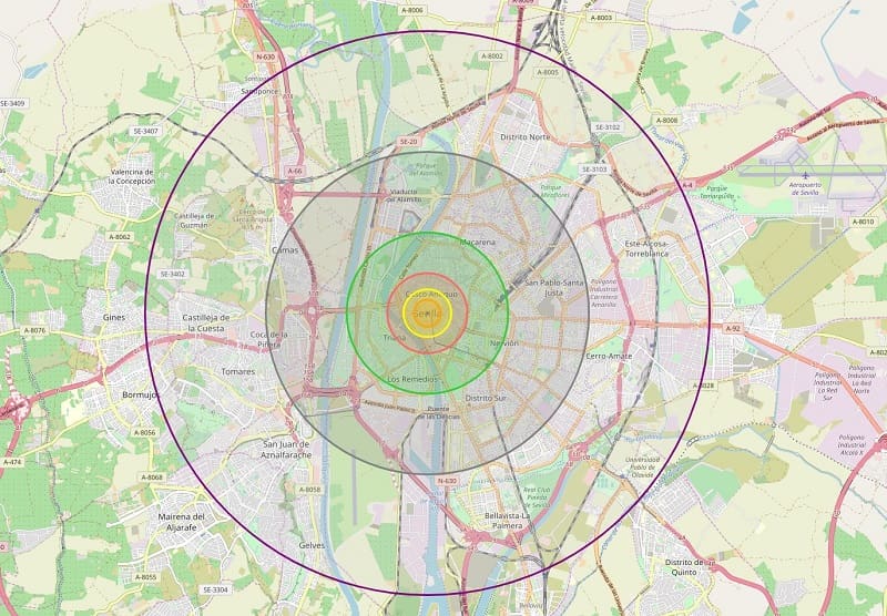 - El círculo naranja es el crater que dejará el meteorito (no hay supervivientes).